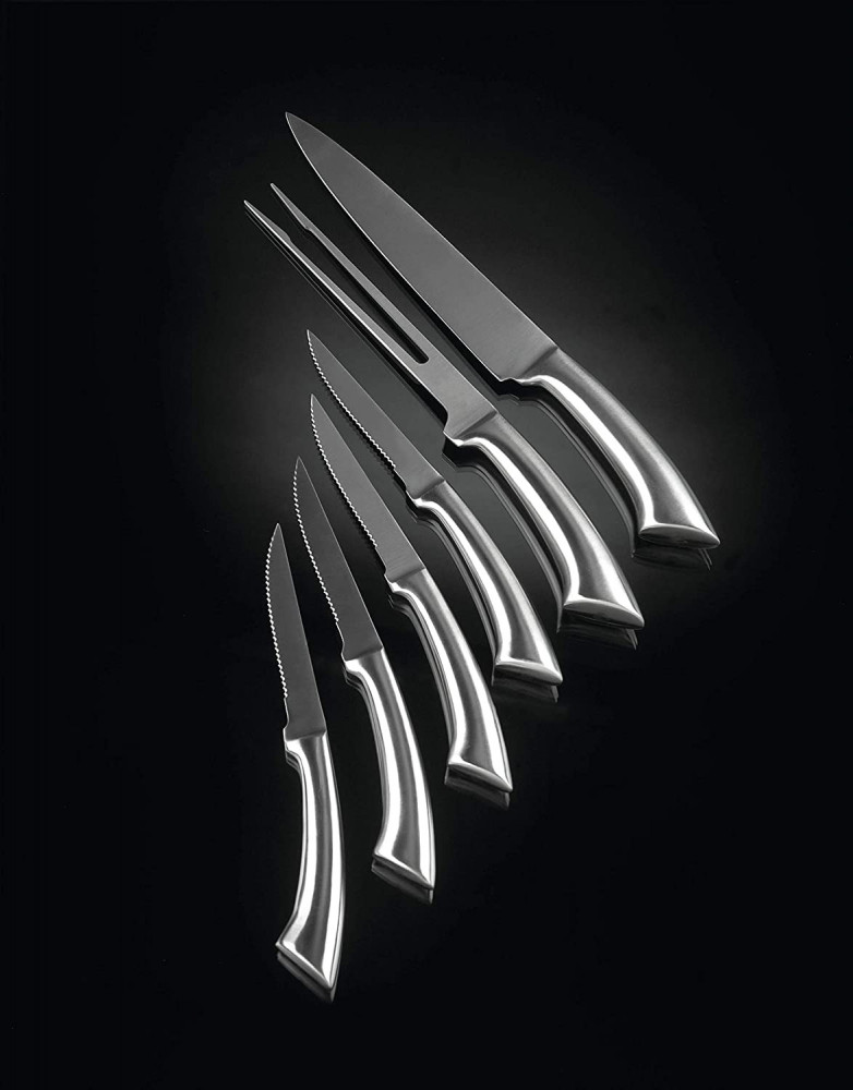تحتوي مجموعة السكاكين الاحترافية من سلسلة PRO من نابليون على كل ما تحتاجه لتقطيع اللحوم بشكل مثالي. تضم مجموعة السكاكين الاحترافية شفرة تقطيع بطول 13.5 بوصة (34 سم) وشوكة تقطيع بطول 12.75 بوصة (32 سم) وأربعة سكاكين مسننة لشرائح اللحم بطول 9.5 بوصة (24 سم). صُنعت كل قطعة في هذه المجموعة من الفولاذ المقاوم للصدأ وهذا ما يسمح باستدامتها لفترة طويلة. تتكوّن كل عناصر هذه المجموعة من قطعة واحدة سلسة، وهذا يعني غياب المقابض غير المحكمة التثبيت والتي قد تتفكك عند غسلها. ويتميز كل سكين في المجموعة الاحترافية هذه بتوازنه التام ويمنحك ذلك شعورًا بالراحة عندما تمسكه بيدك ويضمن المقبض السلس والمستدير الأطراف سهولة الاستخدام. فهذه القطع مثالية إذا كنت أيمن أو أعسر. جميع السكاكين في هذه المجموعة مسنّنة وجاهزة للاستخدام الفوري، وما عليك إلا اختيار واحد لاستخدامه في أحدث ابتكاراتك في مجال الطهي. فإكسسوارات الشواء من نابوليون ذكية ومتعددة الوظائف وسهلة الصيانة، وستعود بالفائدة على كل مطبخ. تزودك إكسسواراتنا بالمعدات الأساسية لإعداد طعام مشوي لذيذ وتوسيع آفاقك في مجال الطهي من خلال مجموعة متنوعة من الإضافات المبتكرة.