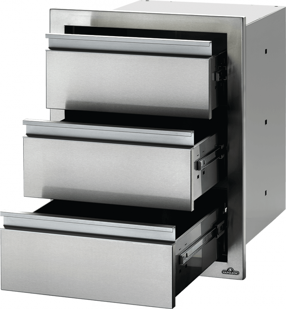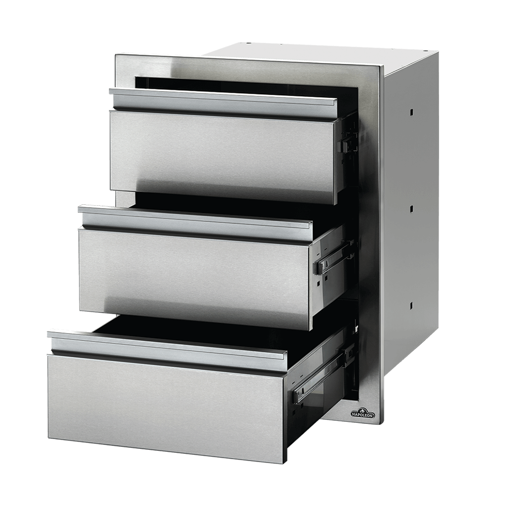 Creating your own custom grill island has never been easier with Napoleon's Built-In Components. Every great outdoor kitchen needs storage; this 18" by 24" triple drawer cabinet features three 8" drawers for outdoor kitchen storage. Stainless steel construction, soft closing hardware, seamless trim, and anodized aluminum handles provide durability and endless installation possibilities.