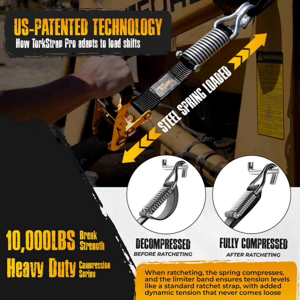 نقدم لك TorkStrap Pro، الحل الأمثل لنقل البضائع بأمان. توفر أحزمة الشد الذاتي مقاس 25 × 2 بوصة، المصممة بتقنية الزنبرك الحاصلة على براءة اختراع في الولايات المتحدة، موثوقية لا مثيل لها. لا مزيد من المتاعب في تعديل أحزمة الشد حيث تعمل TorkStrap Pro على شد نفسها إذا تحرك الحمل أو انخفض، مما يضمن شدًا وأمانًا ثابتين.